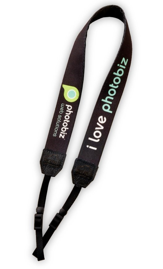 This camera strap is professional strength and made with durable materials. It easily attaches to any camera. The strap is black with PhotoBiz branding.